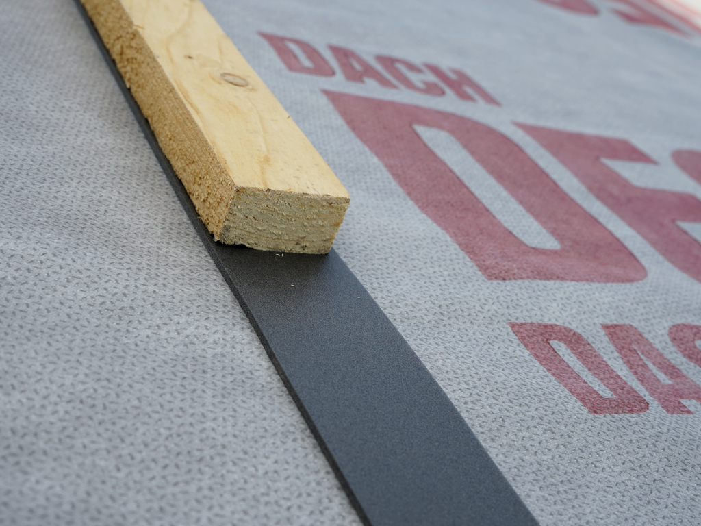 Уплотнительная лента под контробрешетку DR50 применяется для герметизации места контакта контробрешетки с поверхностью мембраны, защищая место прокола гвоздем и скобами.