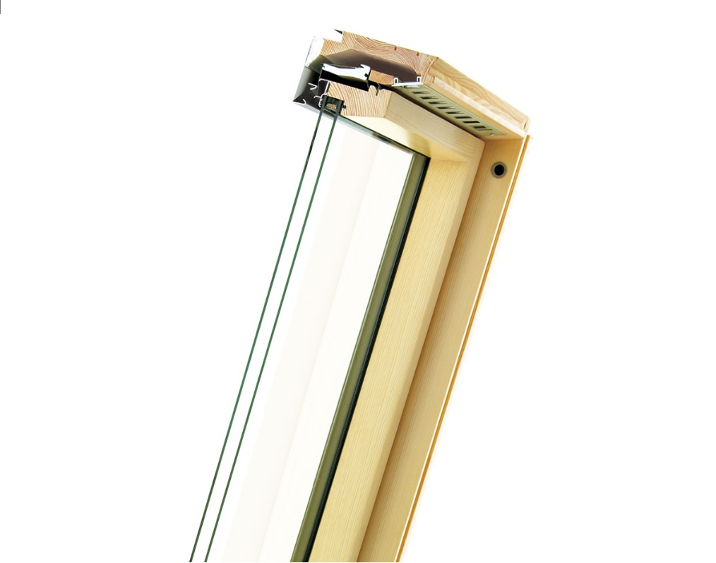 Главная Каталог продукции Элементы кровли Мансардные окна Среднеповоротное деревянное мансардное однокамерное окно FTS-V U2 (55х78см)