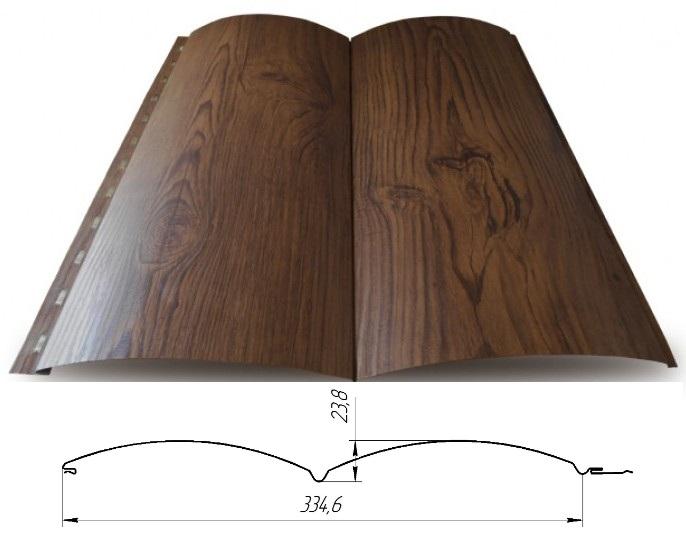 Металлический сайдинг БлокХаус new под дерево применяется для облицовки фасадов в горизонтальном положении. Панель сайдинга изготавливается под размер заказчика длинной от 0,5 м до 6 м (согласно индивидуальной раскладки).