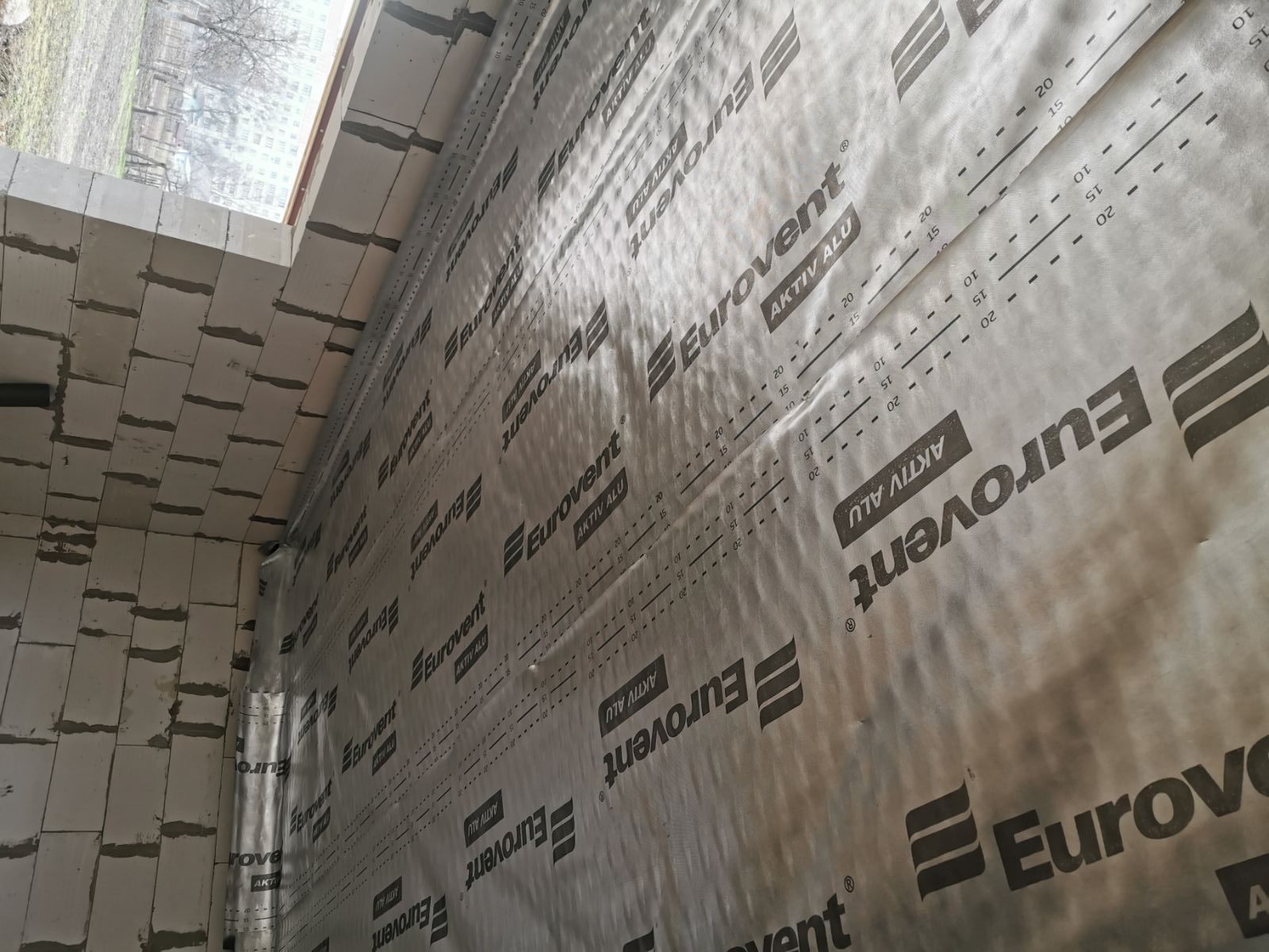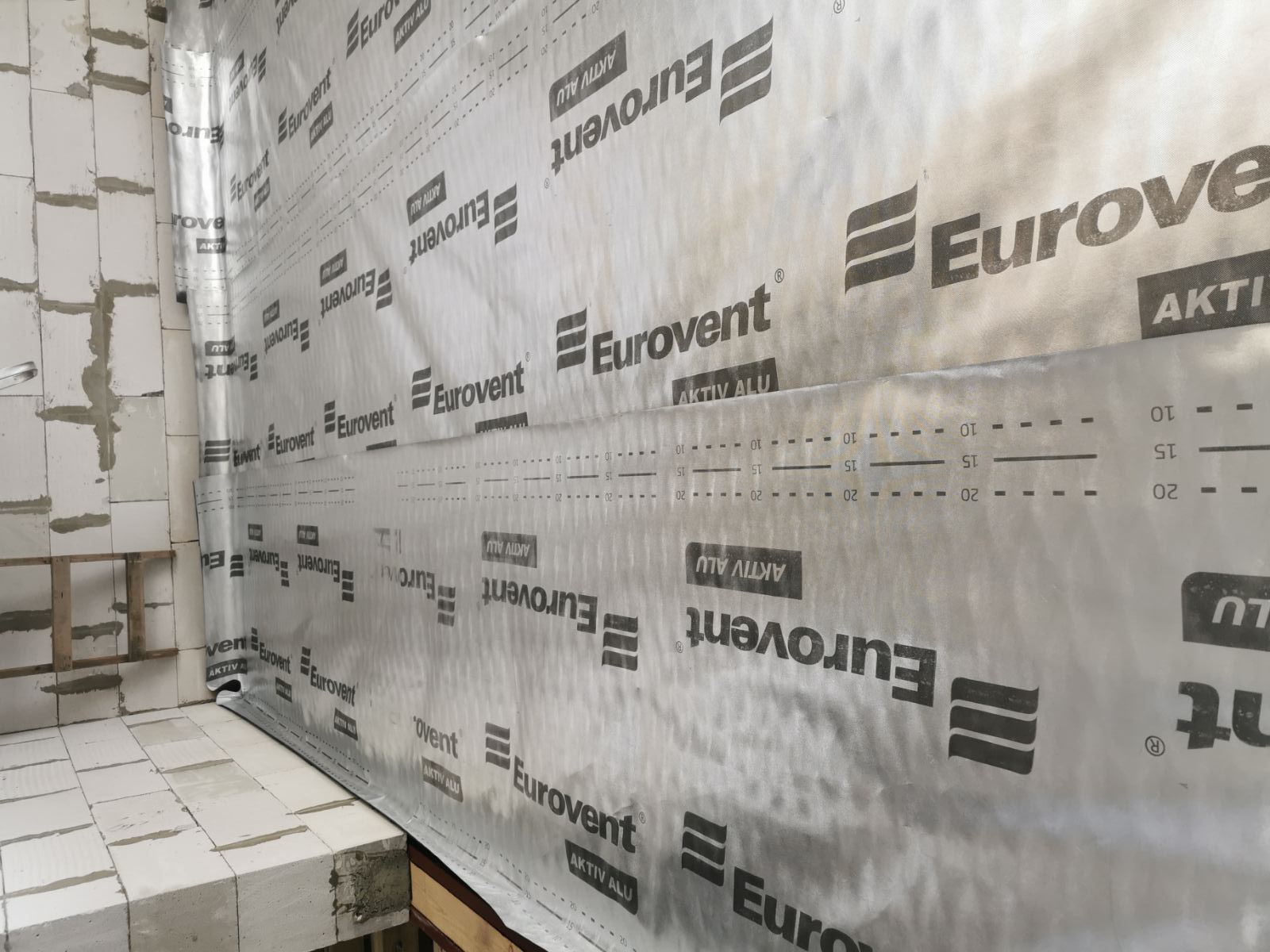 Eurovent AKTIV ALU - 3-хслойная алюминевая пароизоляционная мембрана, состоящая из алюминевого слоя, функциональной пленки и полипропиленого волокна. Фольгированная сторона обеспечивает отражание тепла внутрь здания (уменьшение теплопотерь). За счет полипропиленовых волокн мембрана преобретает активные свойства, предотвращающие конденсацию водяного пара, чего нет в обычной пароизоляционной пленки.
