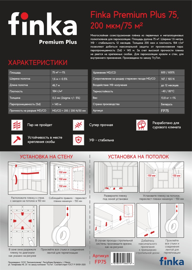 У нас Вы можете купить пароизоляционную пленку Finka Premium Plus 75 м2 по низкой и выгодной цене с постоянным наличием в Минске и доставкой по Беларуси.