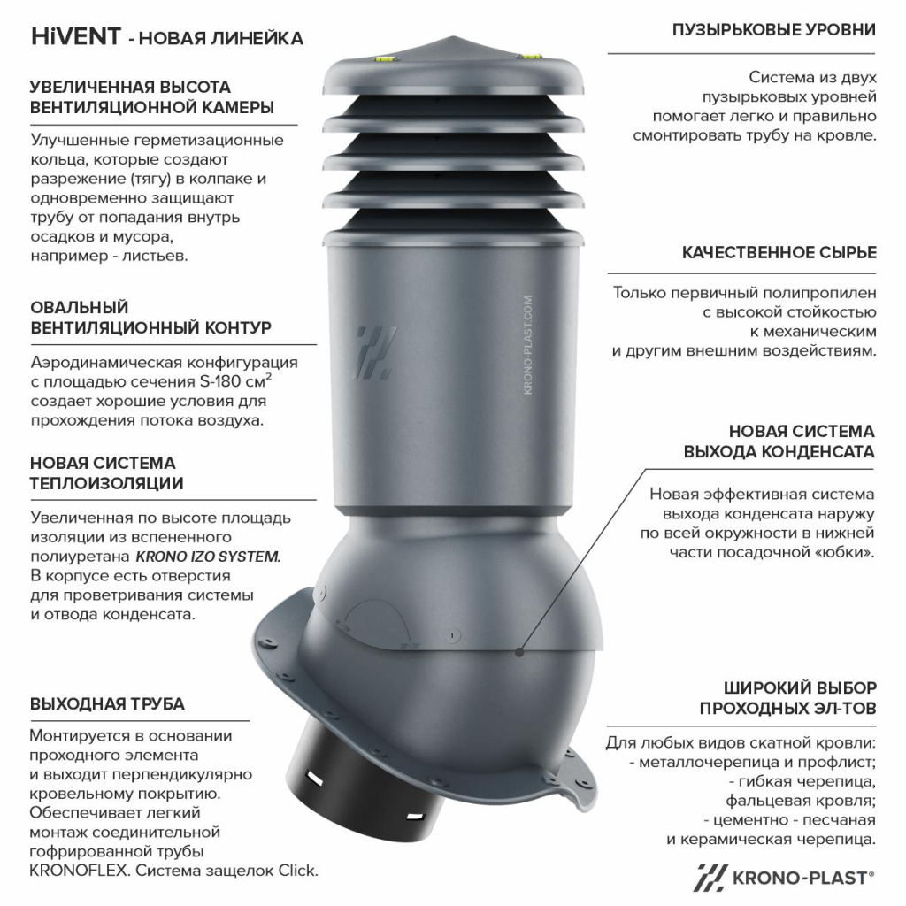 Вентиляционные выходы Kronoplast Hivent D125 представлены в 8 основных цветах по палитре RAL, подходящих к большинству вариантов цветов и оттенков кровельного материала.