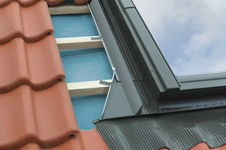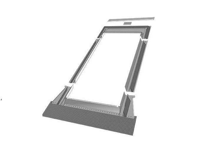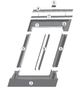 Оклад состоит из 4-х основных элементов (верхнего, нижнего и 2-х боковых). Нижний элемент в форме „фартука” выполнен из алюминия и имеет специальное клейкое покрытие, обеспечивающее прочное соединение с кровельным покрытием. Фартук гибкий и эластичный, благодаря чему принимает любую форму кровельного покрытия. Для обеспечения надежной гидроизоляции окна в комплект оклада входит водоотводящая планка, которую рекомендуется устанавливать на расстоянии 30 см над окном под наклоном, а также специальные поролоновые клинья, которые предохраняют кровельную систему в зоне мансардного окна от проникновения пыли, листьев и снега.