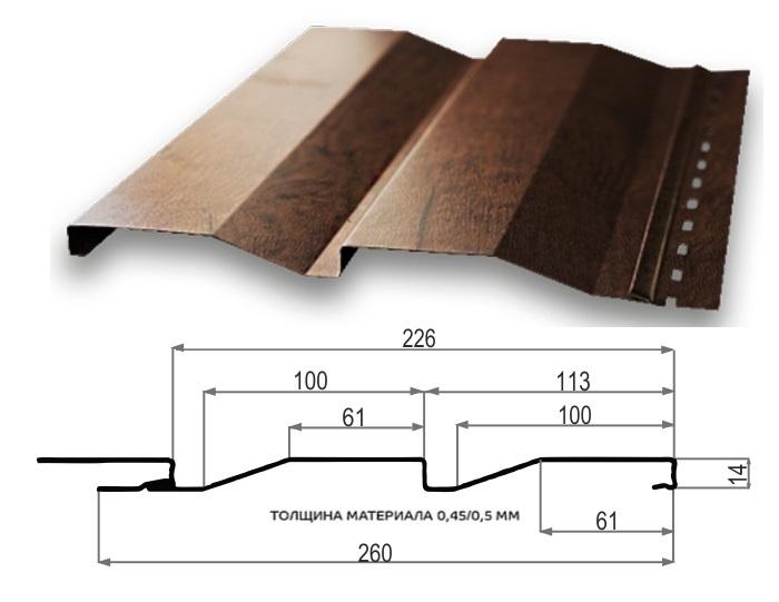 Металлический сайдинг Корабельная доска c имитацией дерева применяется для облицовки фасадов в горизонтальном положении. Панель сайдинга изготавливается под размер заказчика длинной от 0,5 м до 6 м (согласно индивидуальной раскладки).
