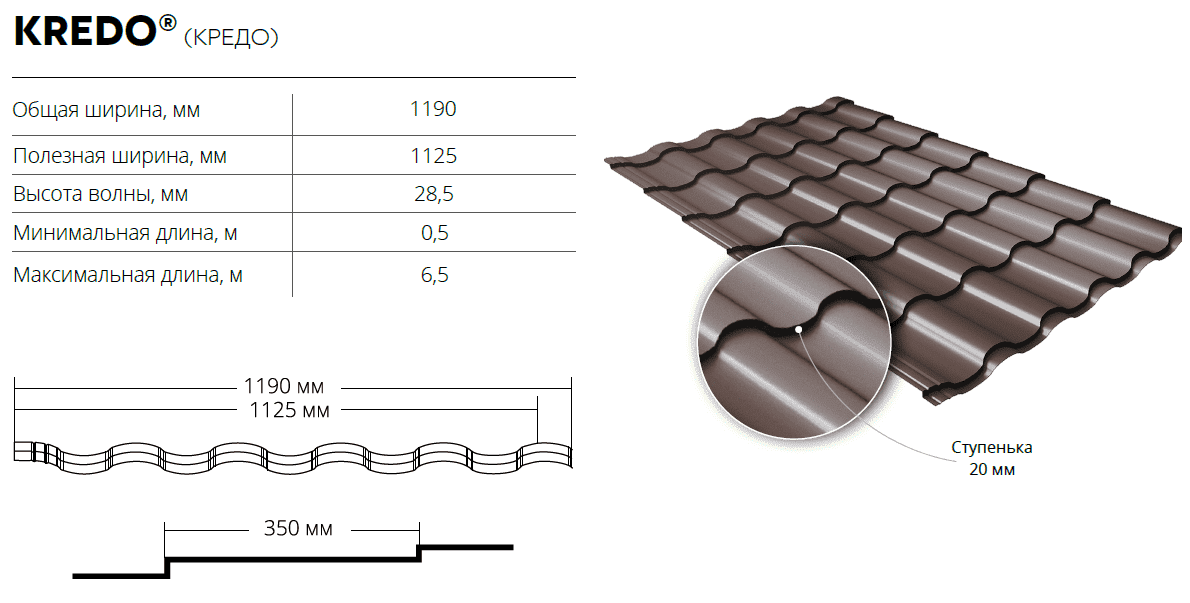 ВАЖНО! Металлочерепица Кредо рекомендуется к применению на скатах до 6,5 м. В случае более длинного ската лучше выбрать другой вариант металлочерепицы.