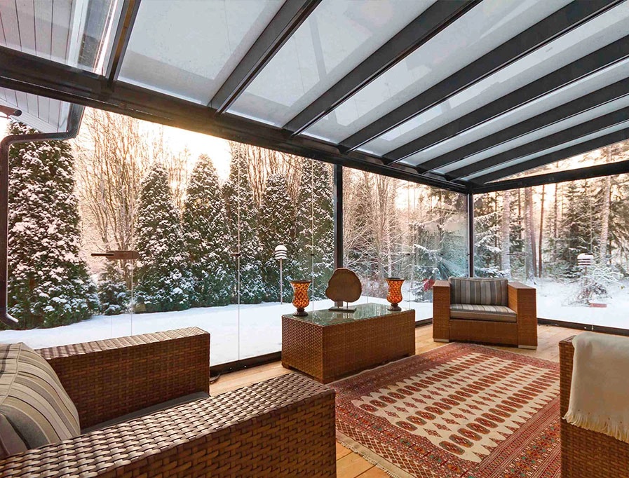 В стандартном варианте панорамного остекления используется классическое прозрачное стекло Флоат бесцветное или Осветленное (Low-iron) с кристально чистым нейтральным оттенком и высоким уровнем светопропускания 92% из-за низкого содержания железа в составе. В зависимости от поставленных задач (защита от холода, солнца) можно выбрать заполнение одним из следуюших видов стекла: