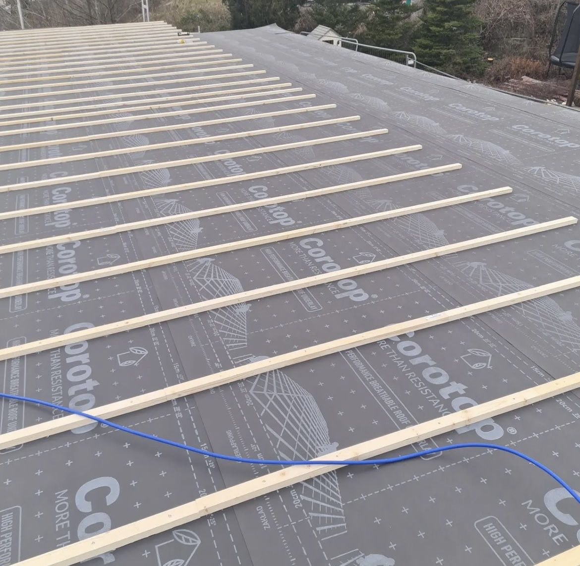4. Установить обрешетку и контррейку. Общая высота контррейки должна быть около 8-10 см. Места прокалывания мембраны скобой или гвоздем следует покрыть герметизирующей лентой.