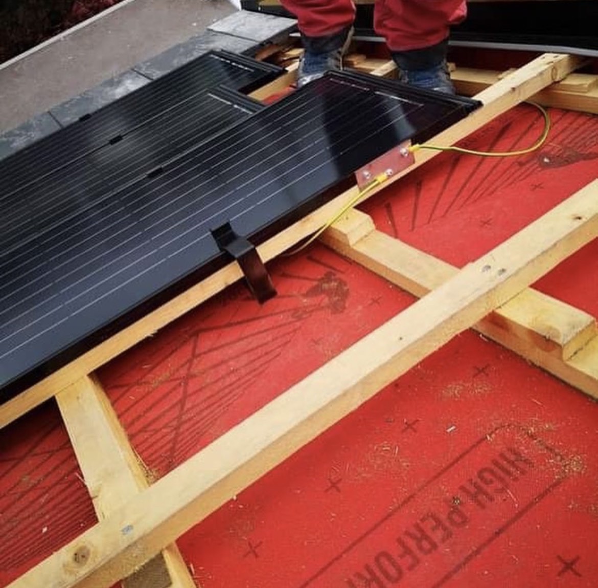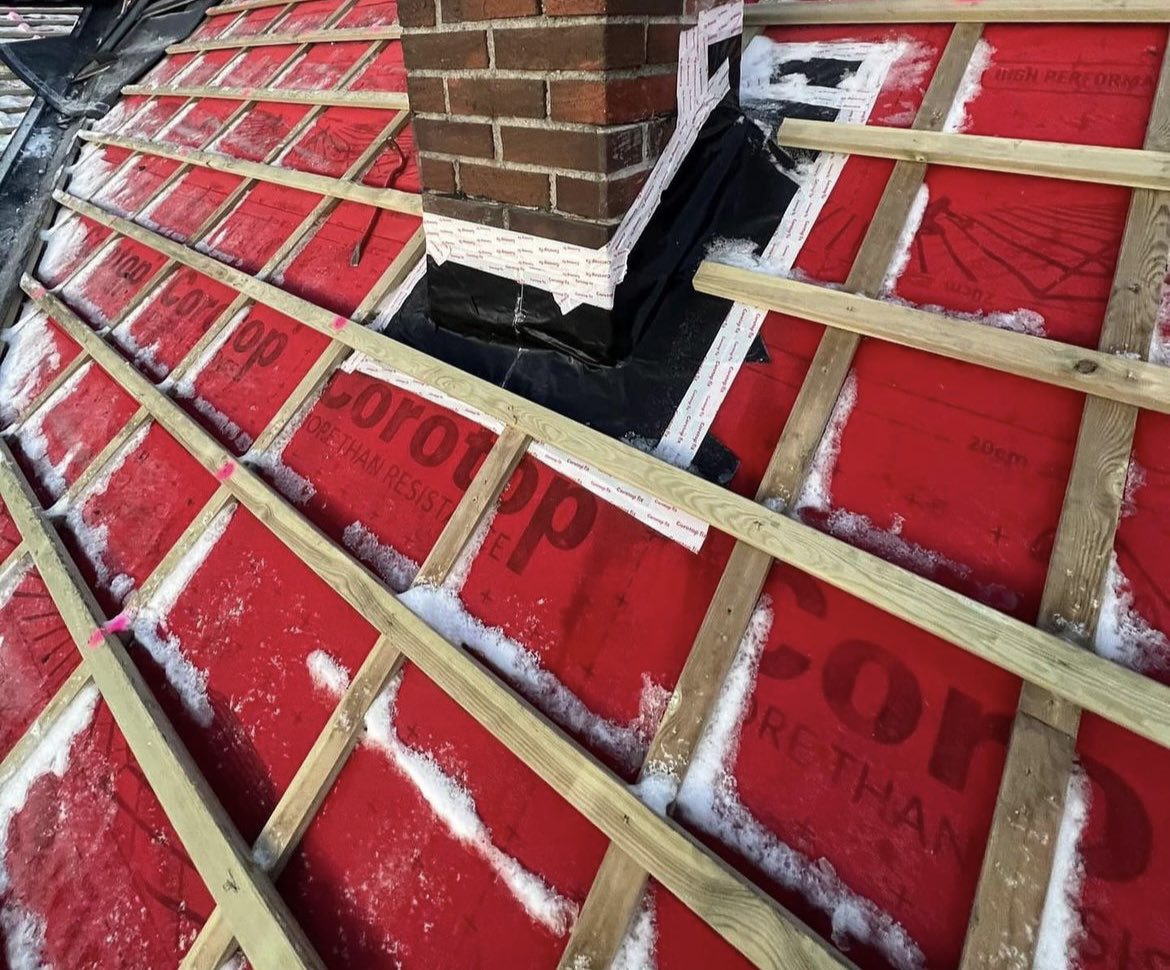 6. При наличии элементов, которые выступают выше плоскости кровли (например, дымоход или стена), мембрану нужно прикрепить бутиловой лентой Corobutyl. Для мелких деталей (вентиляционных выходов) мембрану вырезают в форме трапеции и прикрепляют края к стропилам.