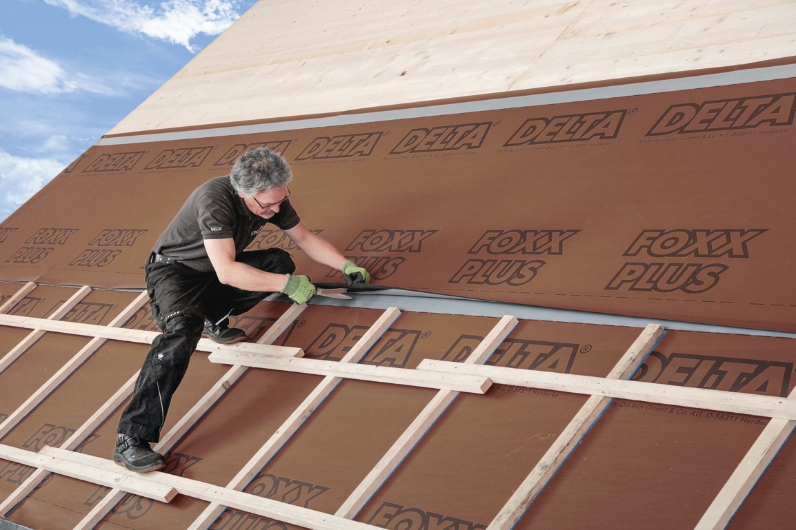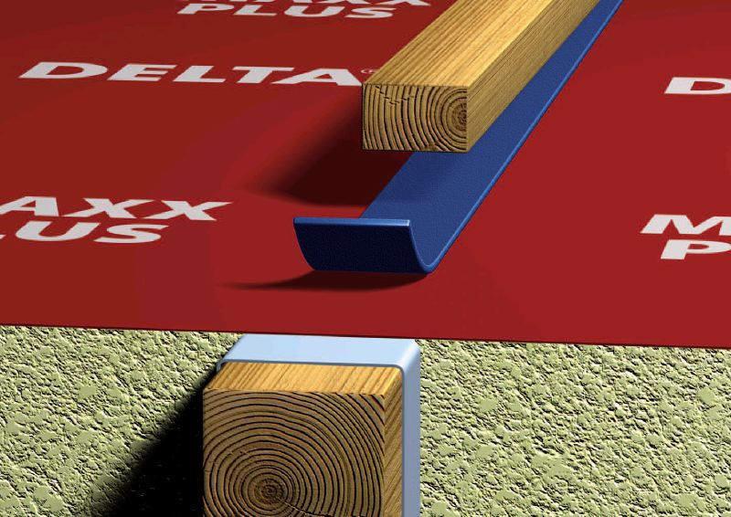 Монтаж гидроизоляционной мембраны DELTA® FOXX PLUS производится внатяг параллельно карнизному свесу при укладке на стропила и закрепляется скобами/гвоздями с широкой шляпкой, уплотнение мест крепления контробрешётки гвоздями защищается лентой DELTA®-SCHAUM-BAND.
