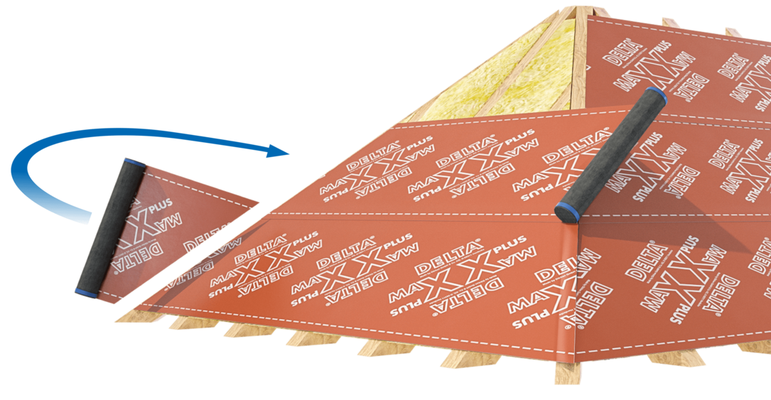 Мембрана DELTA®-MAXX PLUS раскатывается параллельно карнизу и режется наклонно вдоль хребта. Затем разрезанный участок полотна можно просто повернуть на 180 градусов и укладывать в противоположном направлении.