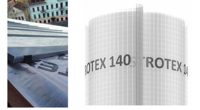 Верхняя сторона пленки STROTEX AC 140 обеспечивает надежную гидроизоляцию кровли, нижняя сторона имеет способность впитывать в себя пар, который впоследствии выветривается через вентиляционные зазоры в области конька. Данный материал рекомендуется для использования в кровельных конструкциях с жестяным покрытием (металлочерепица), но его запрещается применять в мансардном строительстве, когда утепляются скаты кровли.