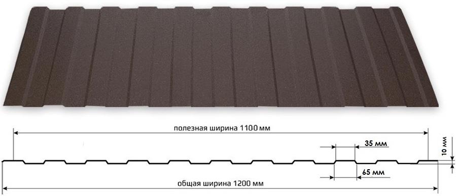 Профилированный лист МП-10 применяется в качестве материала для забора высотой не более 1,5 м (в противном случае забор будет менее устойчив к ветровым нагрузкам). Отличается более мелкой волной (10 мм) и рабочей шириной листа 1100 мм.