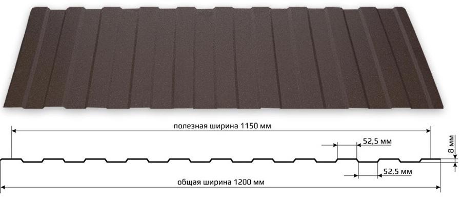 Профилированный лист С-8 применяется в качестве материала для забора высотой не более 1,5 м (в противном случае забор будет менее устойчив к ветровым нагрузкам). Отличается более мелкой волной (8 мм) и увеличенной рабочей шириной листа (1150 мм).